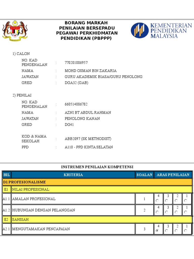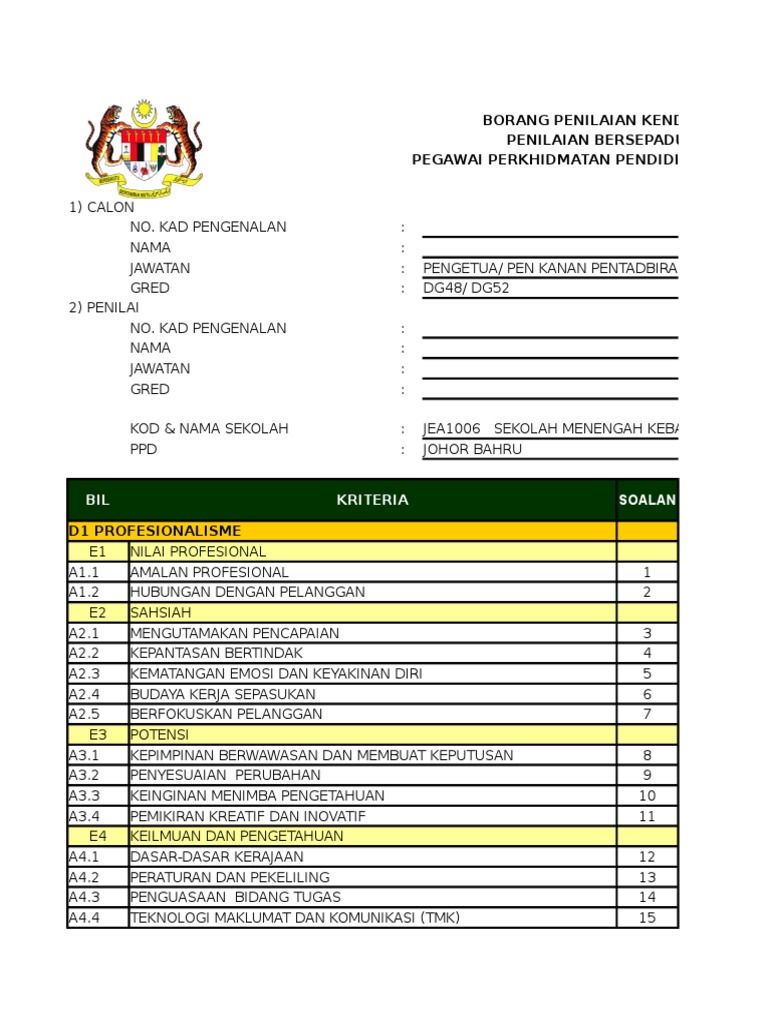 Borang Skor Penilaian Bersepadu Pegawai Perkhidmatan Pendidikan Pbppp Excel